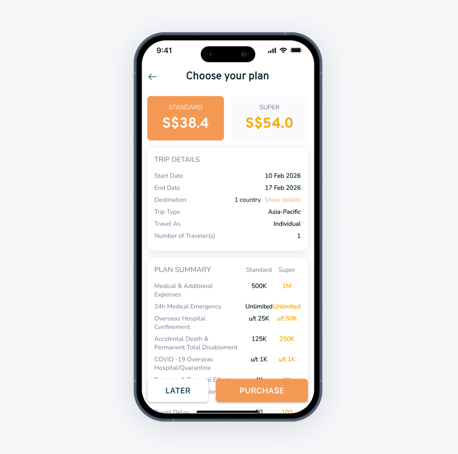 Our Travel Insurance is designed to cater to all types of travelers, whether you’re traveling for business or pleasure. Our enhanced Standard Plus and Super Plus plans offer comprehensive protection for everything from small annoyances to significant crisis, ensuring you’re covered on every trip.