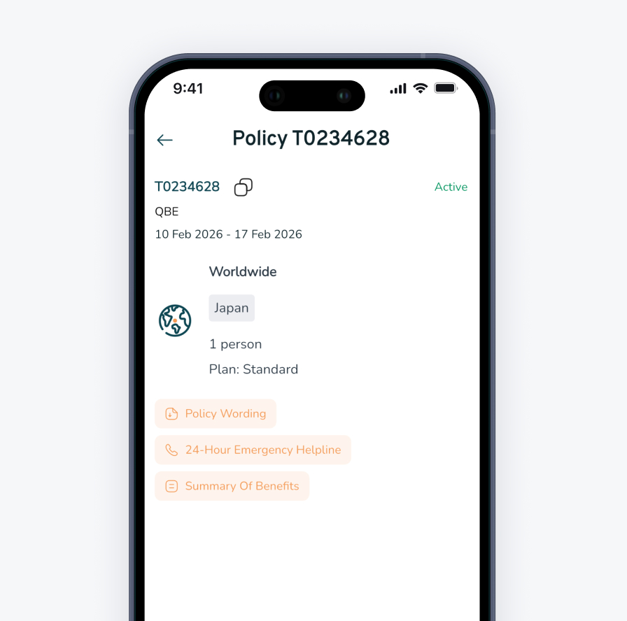 Access all your travel policies anytime through the app. View your coverage details, emergency helpline, and benefits summary in-app easily.